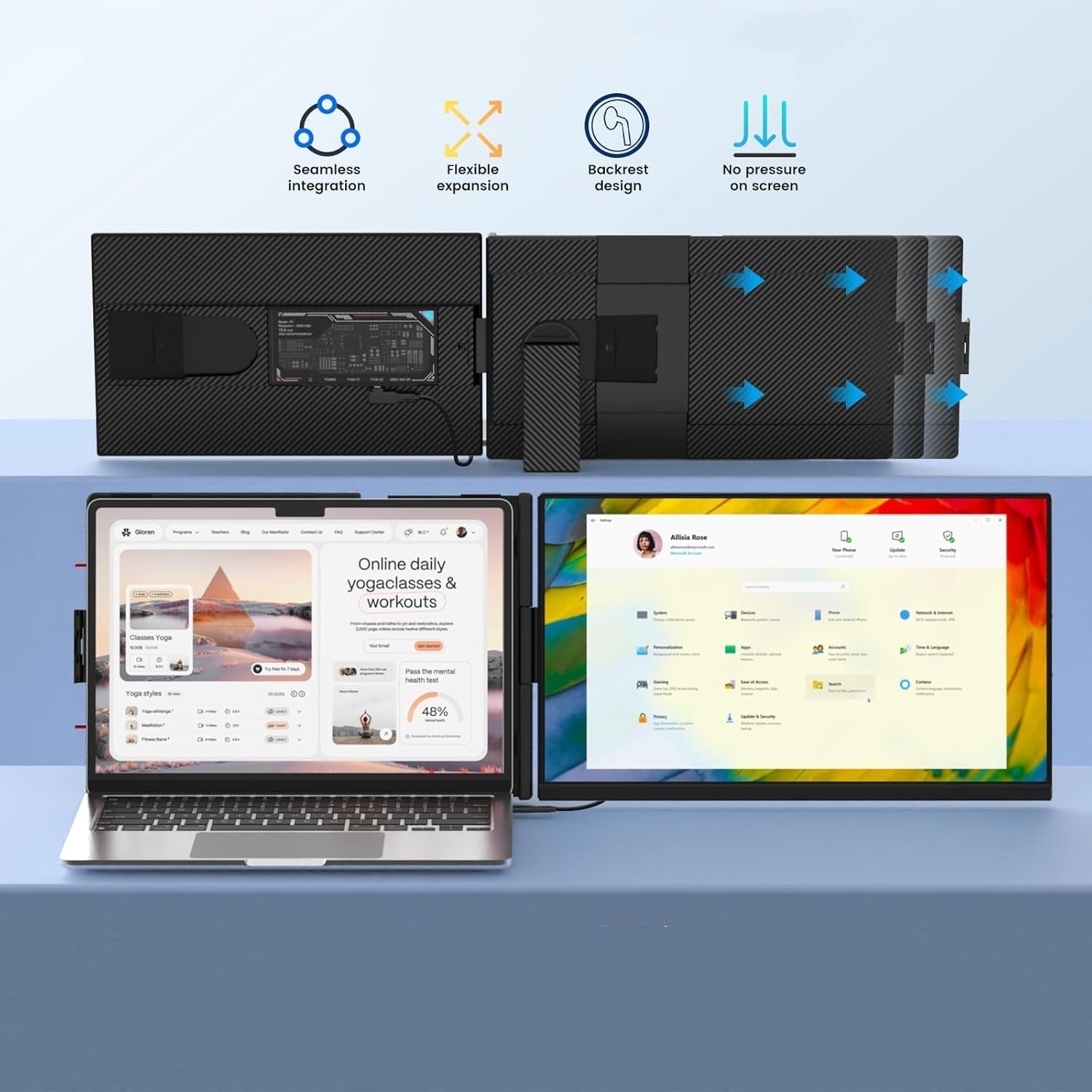 - New Construction & Easy to Use:Features a new design that allows it to be clipped to the left or right side of the laptop, or even without clipping, making it compatible with all laptop sizes. At the same time, it uses a detachable design, so that it can quickly become a travel portable monitor. With the single screen stand, you can switch between horizontal and vertical screen, so that configure your extended screen according to your needs and preferences.